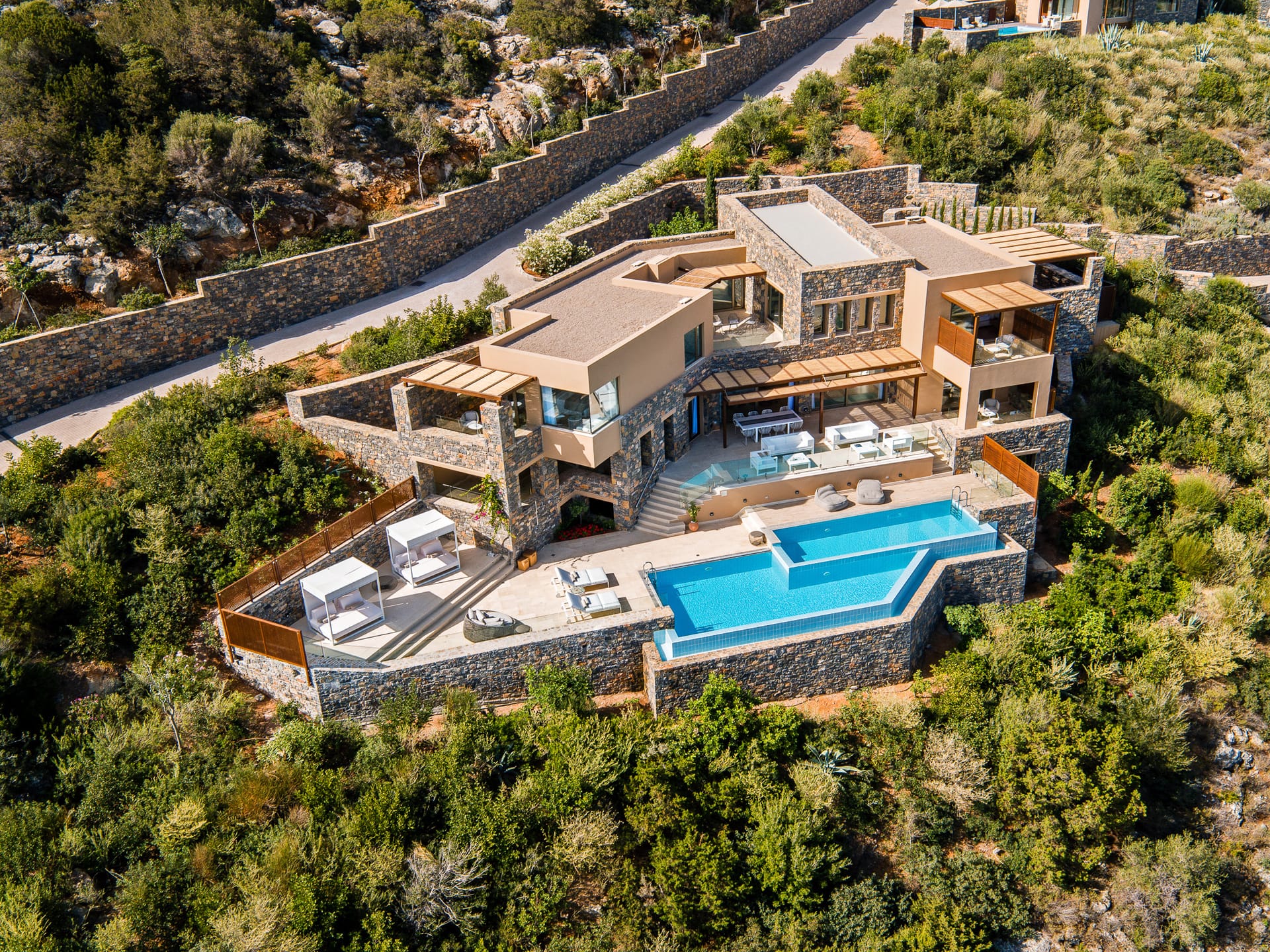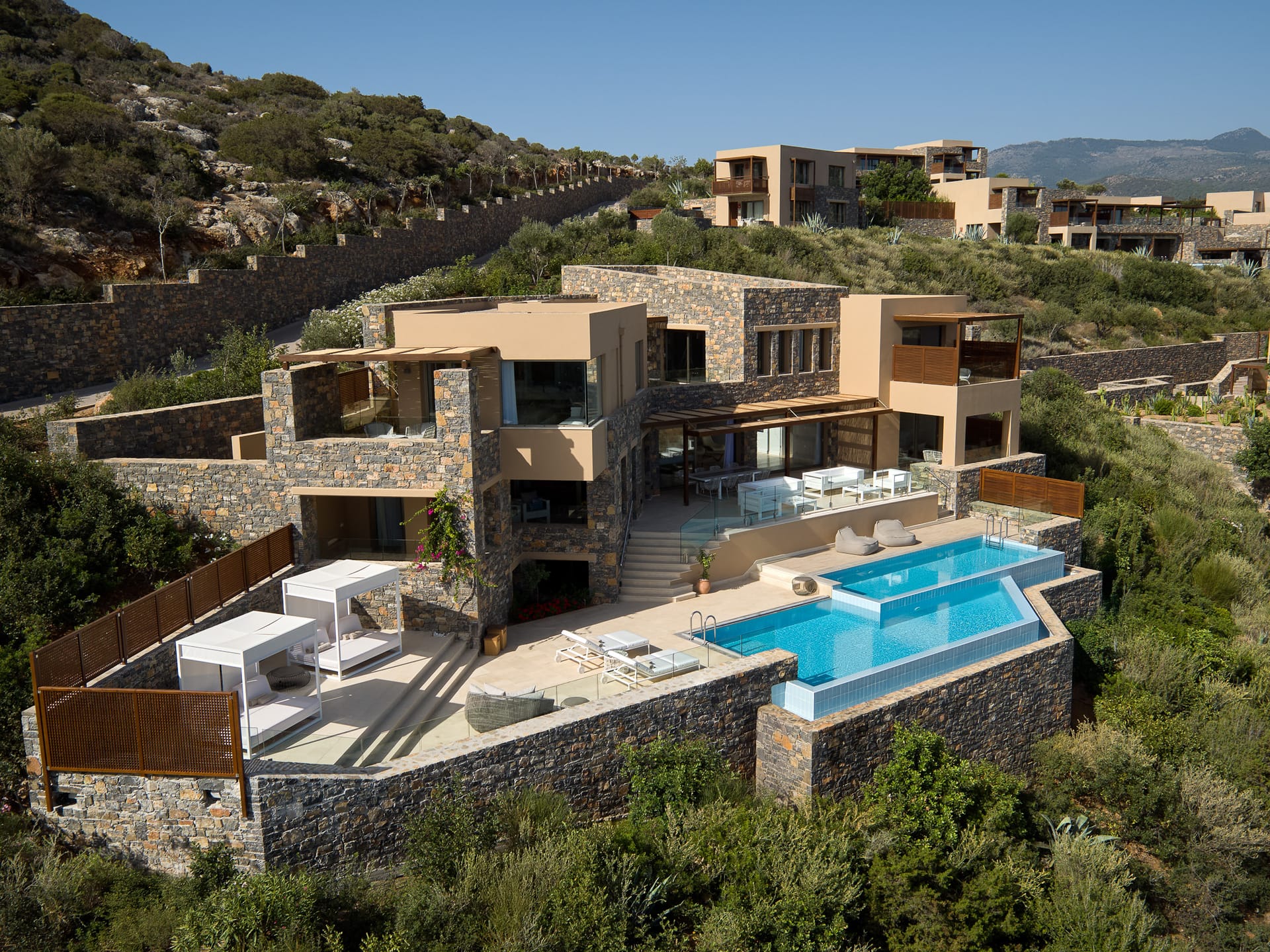 From the outside, The Mansion at Daios Cove — stately, stylish and smart — is a marvel of modern architecture, built with natural materials that complement its spectacular hillside location.