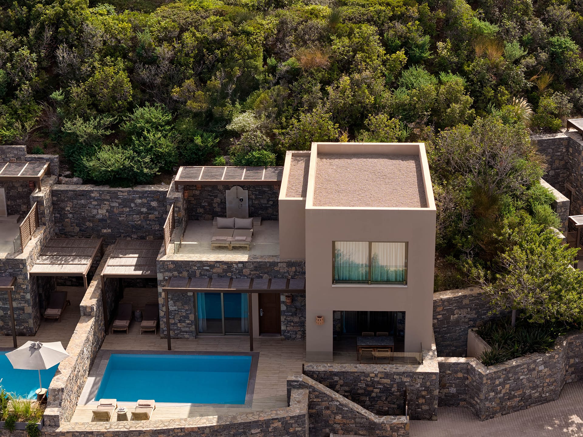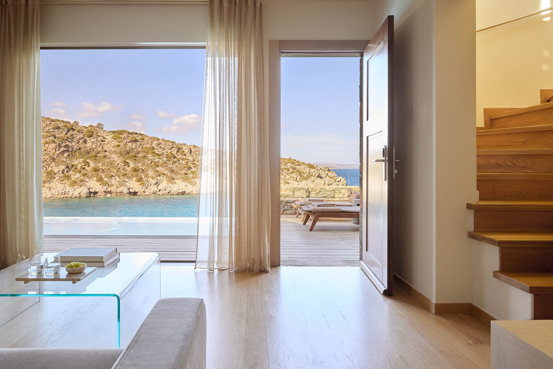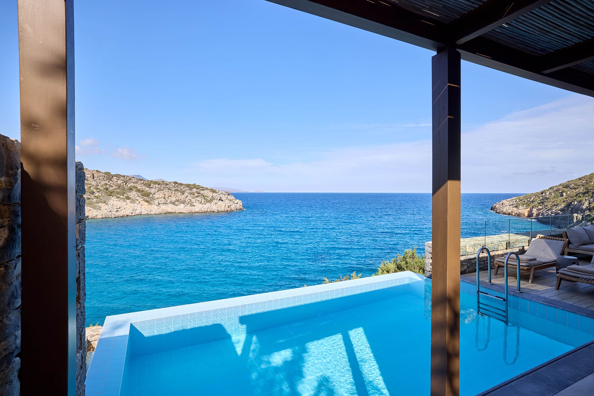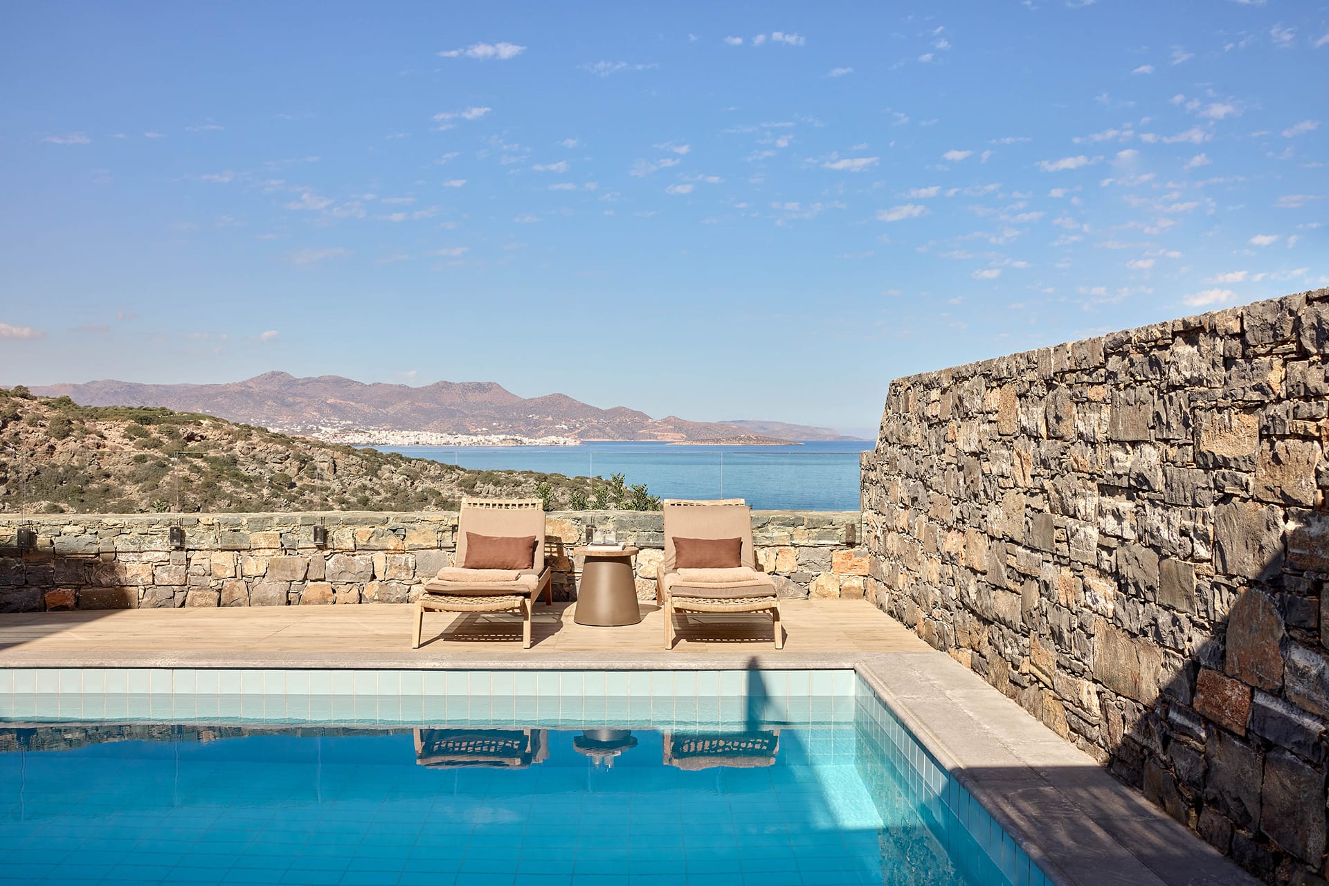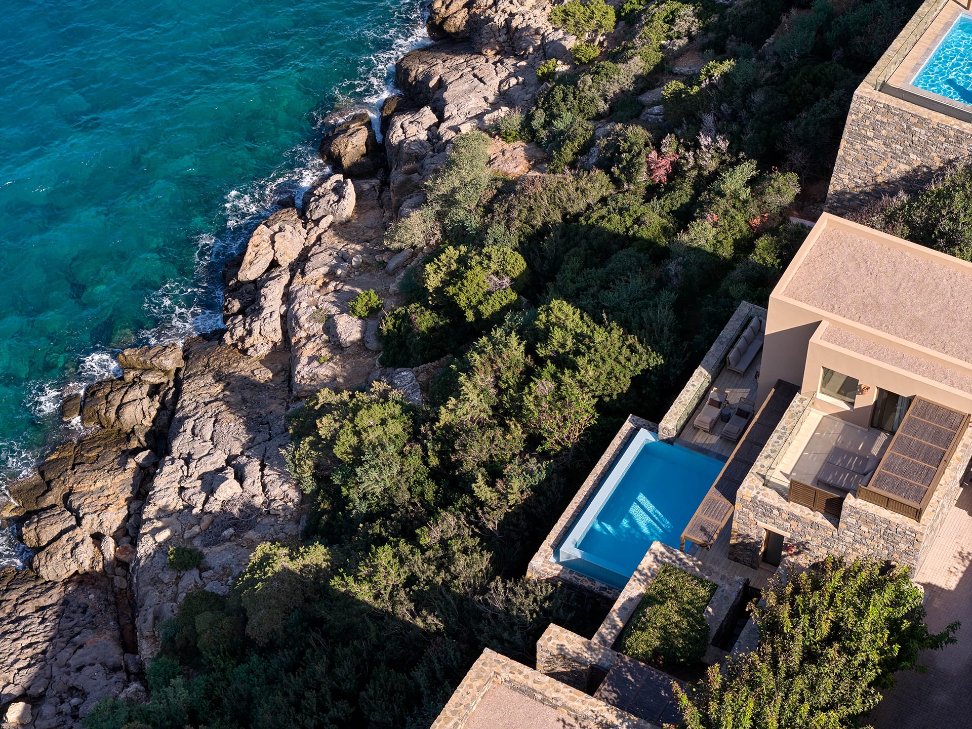 At the most exclusive and private area of the resort, you will find our large two bedroom villas ideal. Enjoy our spacious and private sundeck area, as well as a large seawater swimming pool. This villa can accommodate up to 5 guests in its two sea view bedrooms, each with its own bathroom.Indulge yourself in the independent living room with majestic views to Daios Cove. Our exclusive Cove Club Services will be delivered throughout your stay.