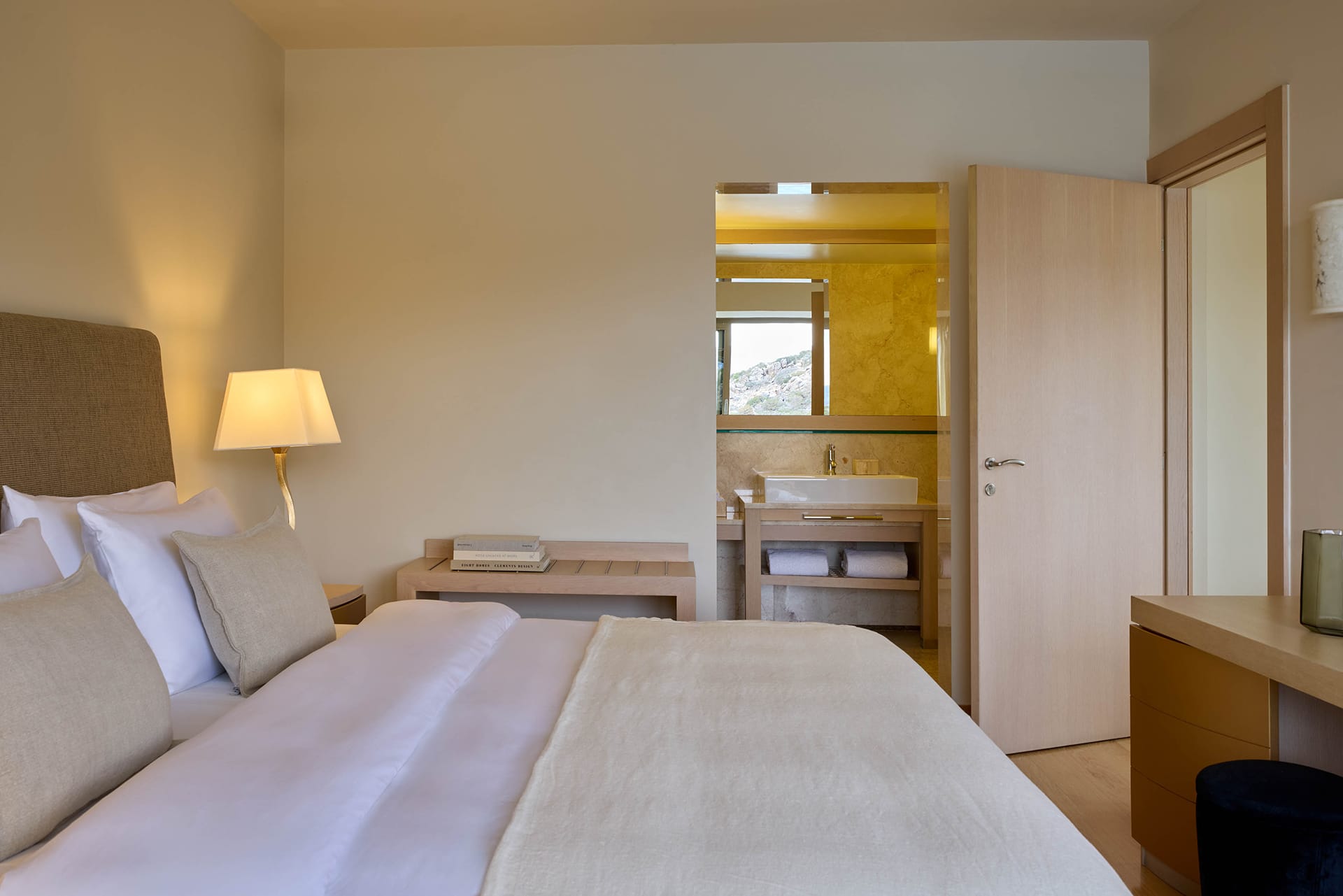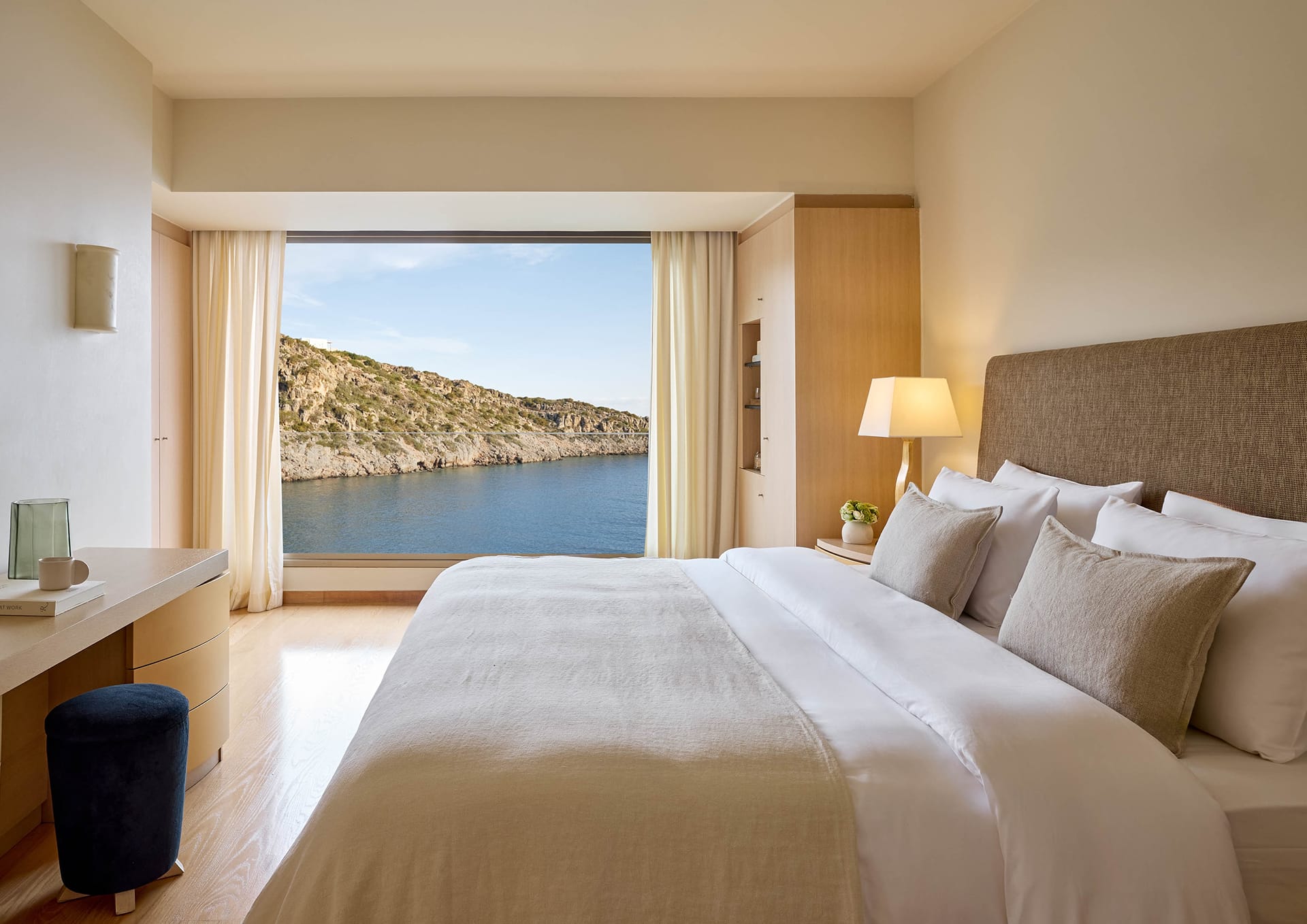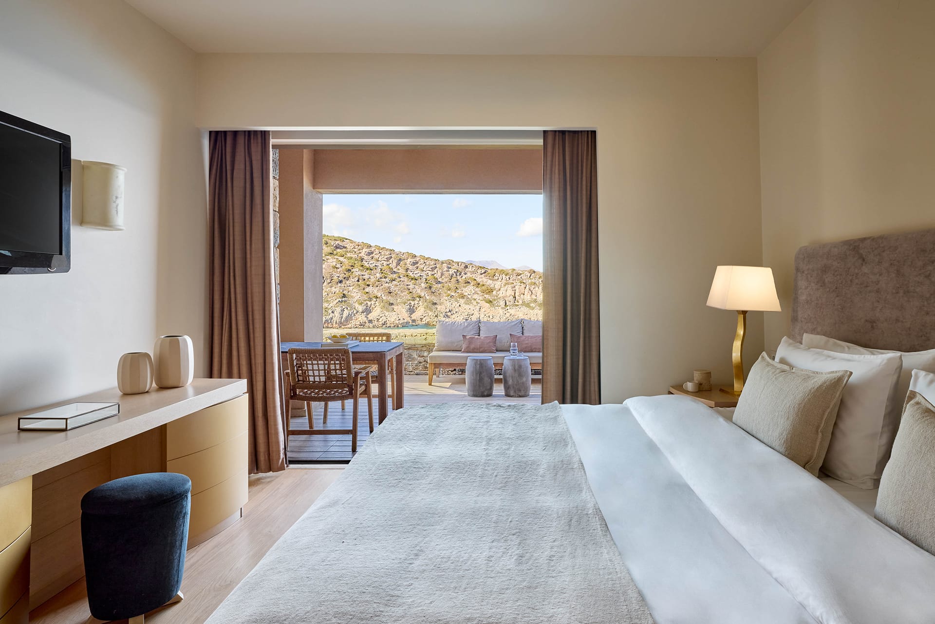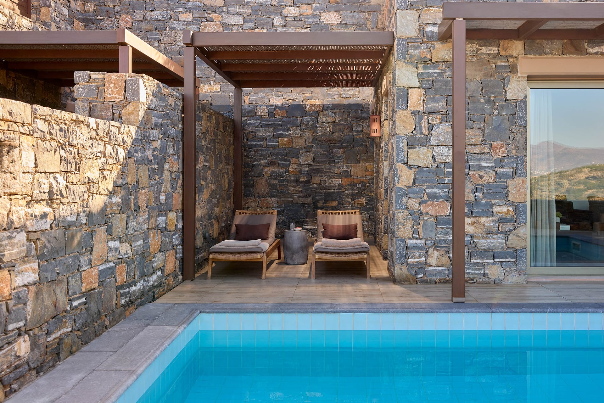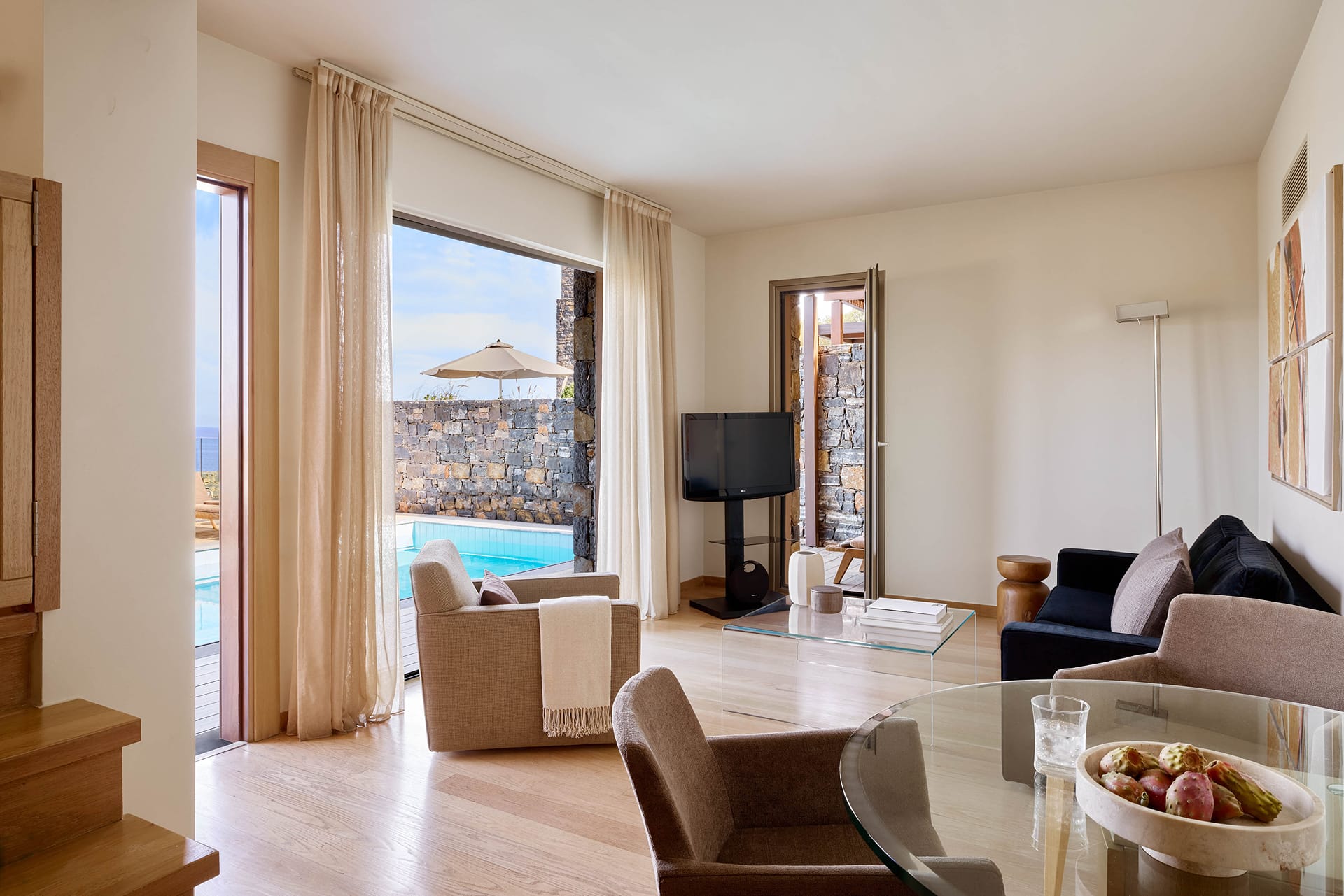 At the most exclusive and private area of the resort, you will find our large two bedroom villas ideal. Enjoy our spacious and private sundeck area, as well as a large seawater swimming pool. This villa can accommodate up to 5 guests in its two sea view bedrooms, each with its own bathroom.Indulge yourself in the independent living room with majestic views to Daios Cove. Our exclusive Cove Club Services will be delivered throughout your stay.