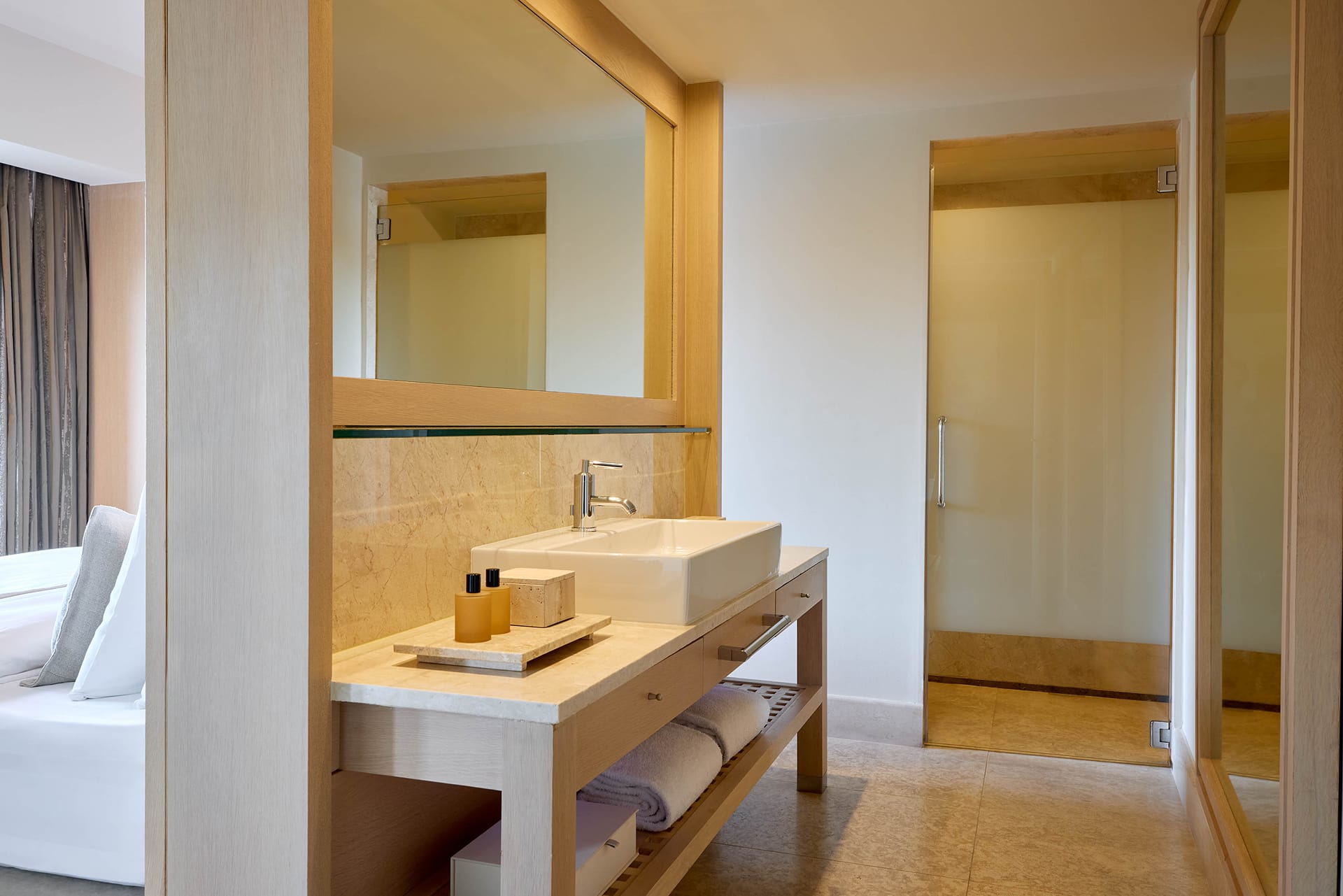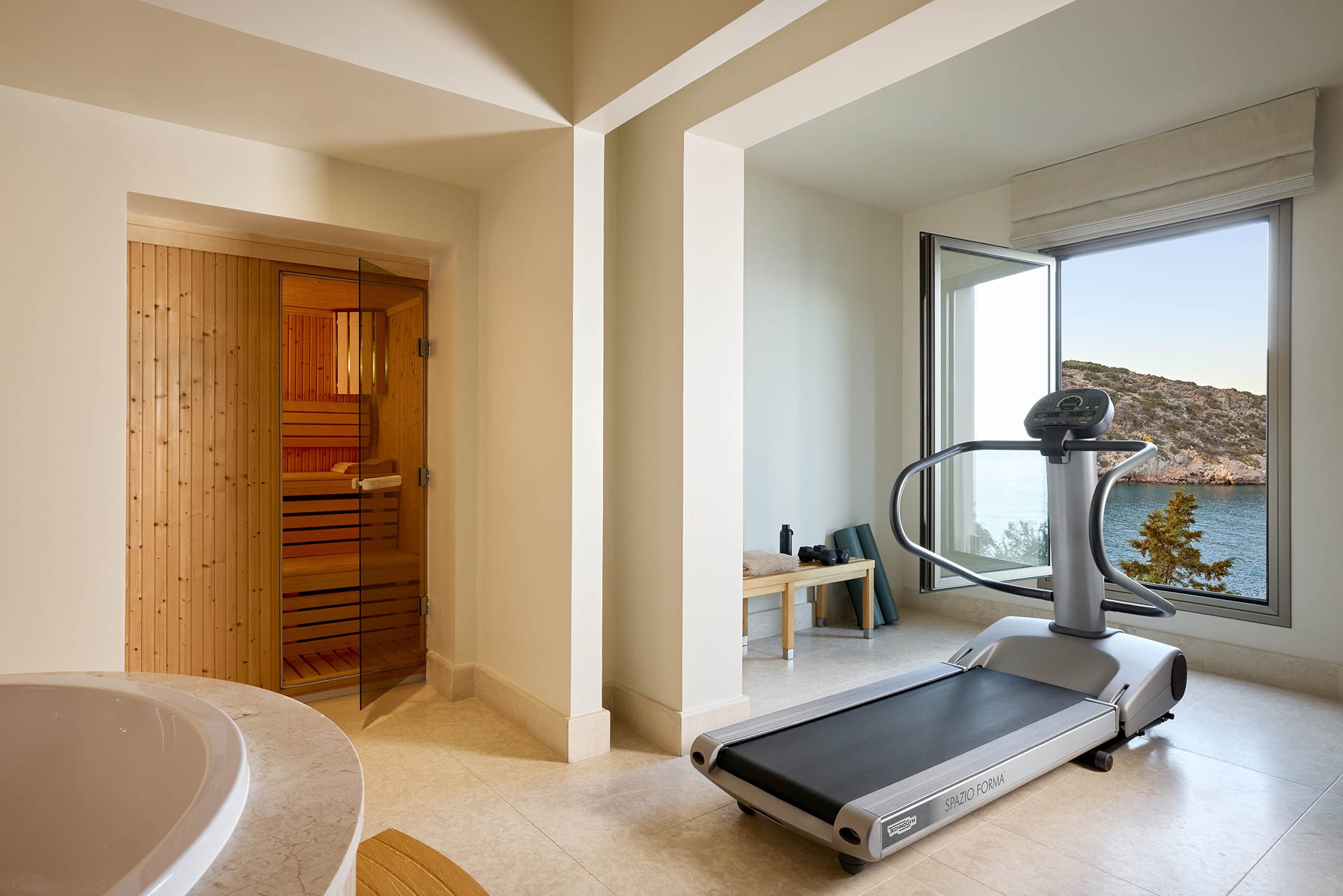 Enjoy breathtaking vistas of the private Cove and the Mediterranean Sea from your private wellness area including Finnish sauna, Technogym treadmill and oversized round bathtub. This villa offers you the ultimate wellness experience while enjoying its large, private, heated seawater swimming pool and sundeck area.